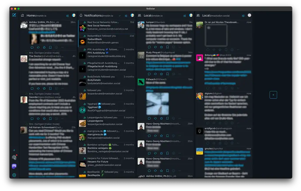 Fedistar è organizzato a colonne e ricorda un po’ le tradizionali interfacce di lettura RSS ma è adattata al flusso continuo dei social federati. Ogni colonna può visualizzare una timeline diversa come ad esempio “Home”, “Locale”, “Hashtag” o “Ricerca” e potete regolare la larghezza di ciascuna a vostro piacimento. Questo approccio vi consente di tenere sotto controllo più conversazioni simultaneamente, passando rapidamente da una all’altra.